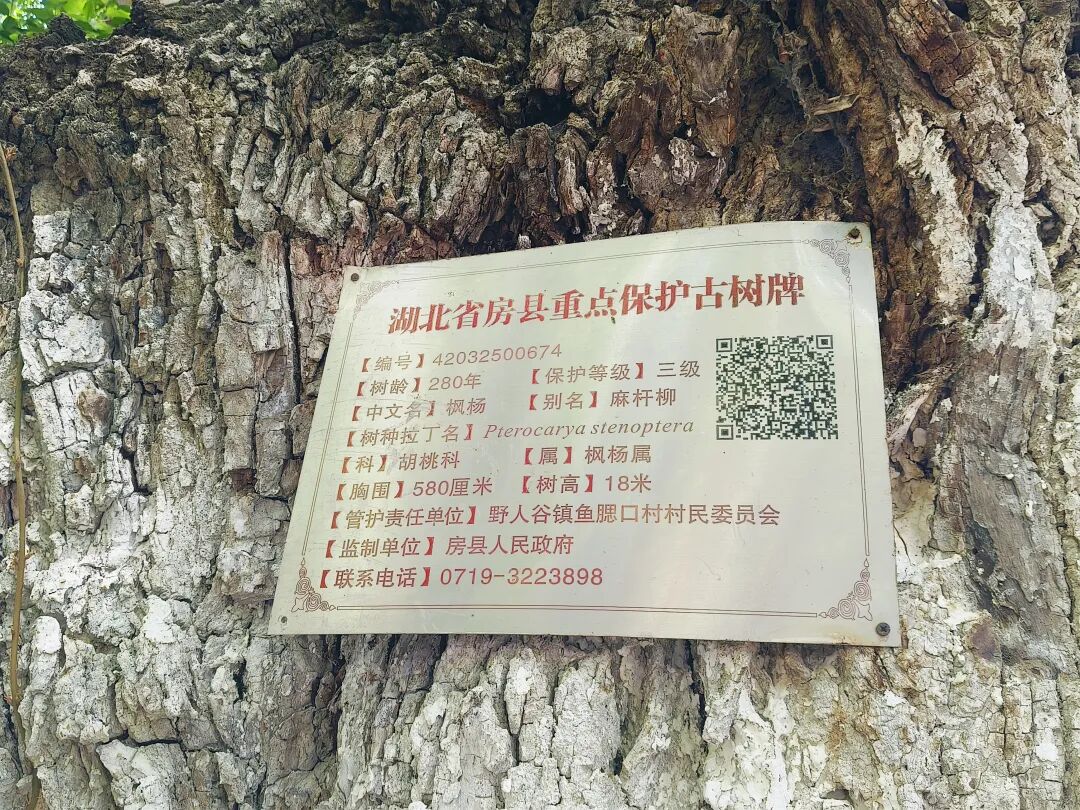 枫杨古树绽风采,守护祖辈平安乐!远远望去,古树枝繁叶茂,在周围延伸着树枝与树干,好似要包围着一切收到自己的怀抱里,给与它们安全。走近看来,在古树身份证牌上才发现这是一棵已经有了280年的枫杨,别名麻杆柳,保护等级为三级,树高18米。为了看看这棵古树有多宽,我们手拉着手、胳膊伸直,一起围绕着古树转圈,刚好5个人。阳光洒落在枫杨的头顶上,为它注入生命力,村民们在这乘凉或玩耍,好不自在。而高大的枫杨也成为鱼鳃口村一道靓丽的风景线,沙沙的声音唱着低沉的歌,它的枝干苍劲舒展,如同一把墨绿色巨伞。它见证了鱼鳃口村沧海桑田的变迁,在一圈圈年轮里镌刻着对村民的守护与期望。