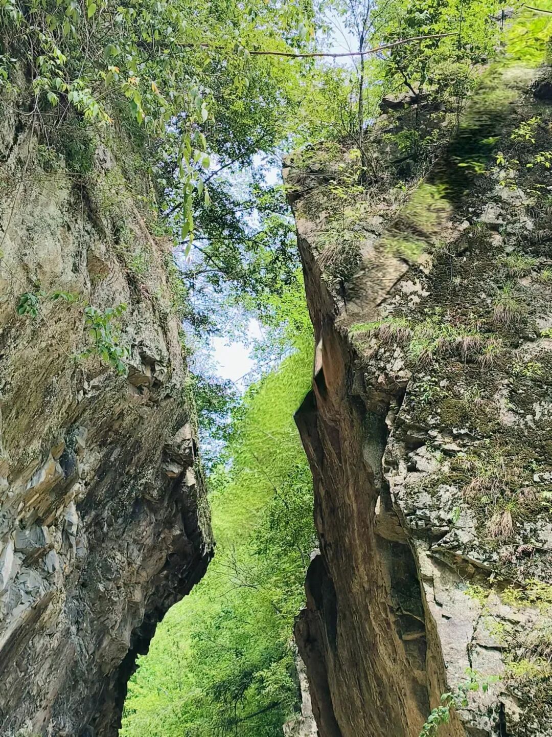 崇山峻岭一线天。何为一线天?两壁夹峙,缝隙所见蓝天如一线。驻足在石壁前,欣赏着大自然的鬼斧神工。我不禁在脑海中思考,它们是如何形成的?又是谁发现了这一处好地方?一步一景,远看无路的地方,走近却忽然转折开朗,呈现出新的景色。一线,正如我们遇到的事情,在前进或后退中,总有一线生机,而我们要做的是想尽办法坚持去解决它。