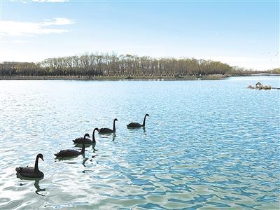 黑天鹅一家在团城湖调节池“落户”。(北京市水务局供图)