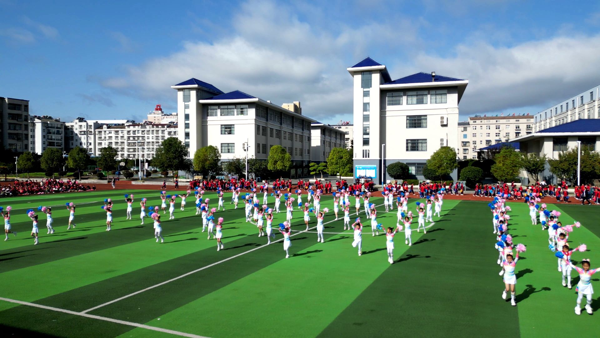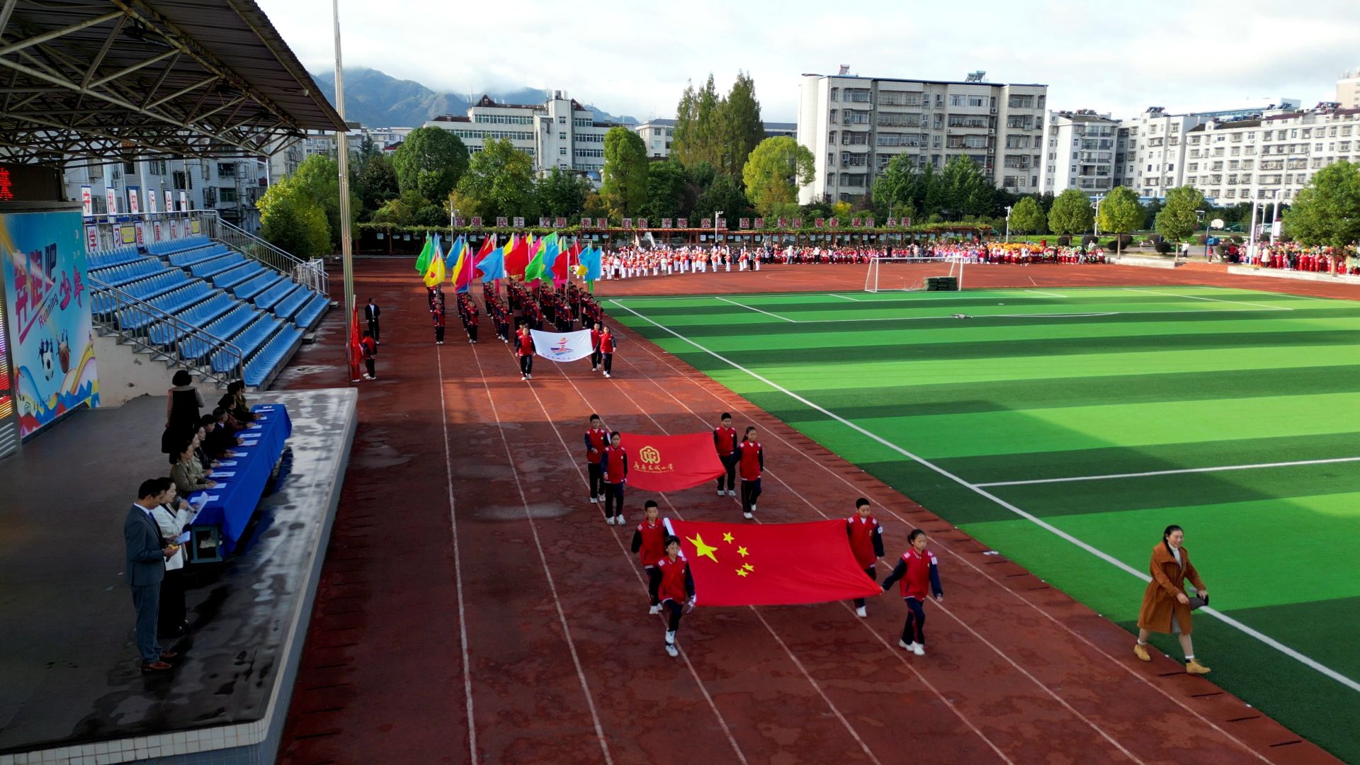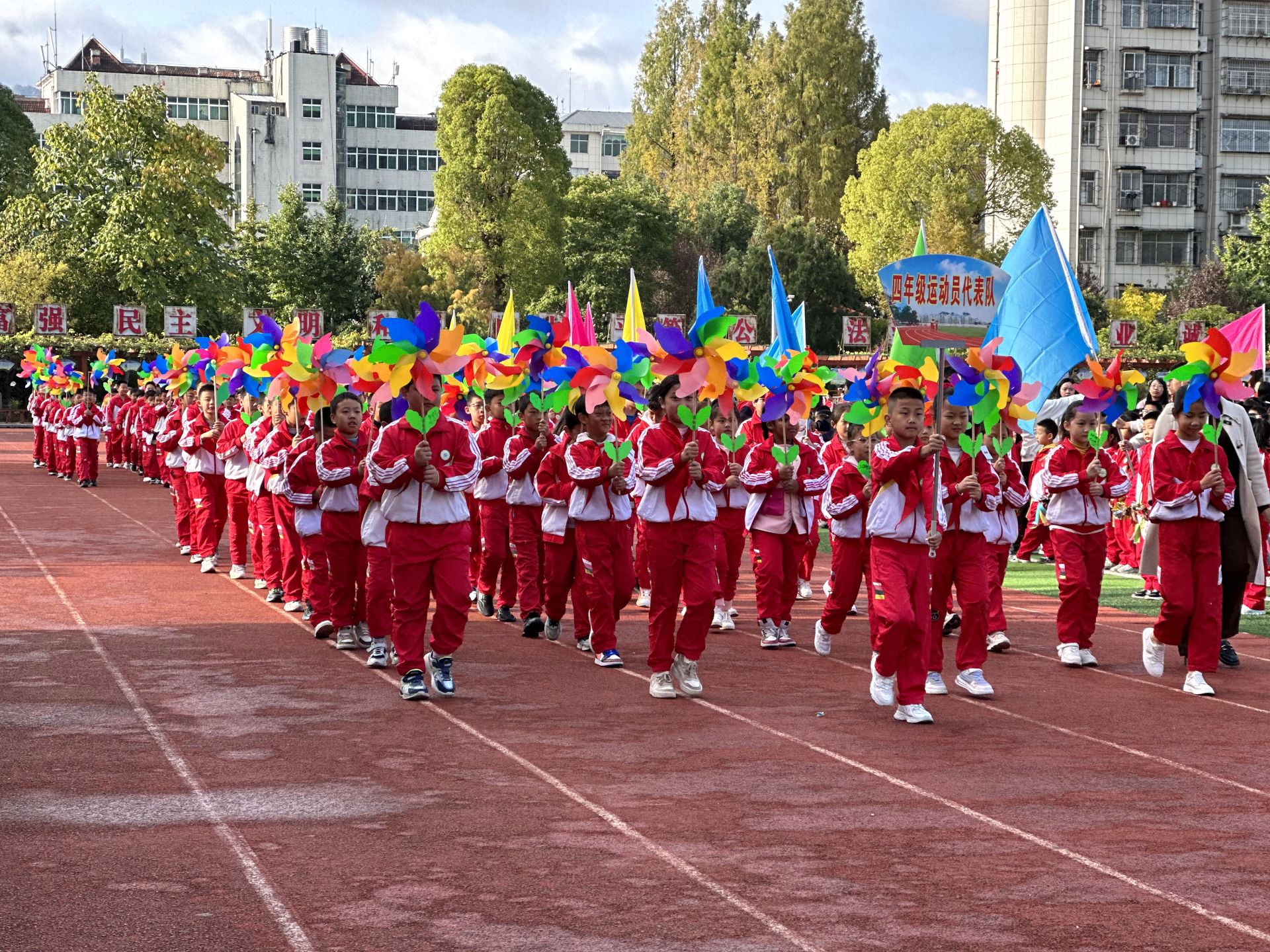 开幕式上,国旗护卫方队、彩旗标兵方队在响亮的口号声中踏着整齐的步伐经过主席台,各班级代表队依次入场。每个班级都精心设计了独特的入场式,学生们身着统一的服装,口号嘹亮,童心飞扬,有的年级手持鲜花,有的年级挥舞着彩帽,充分展示了班级文化和创意。随后,部分年级依次进行了方阵表演,饱满的热情,配上鲜艳的服饰、特色的道具,引得现场观众连连称赞。