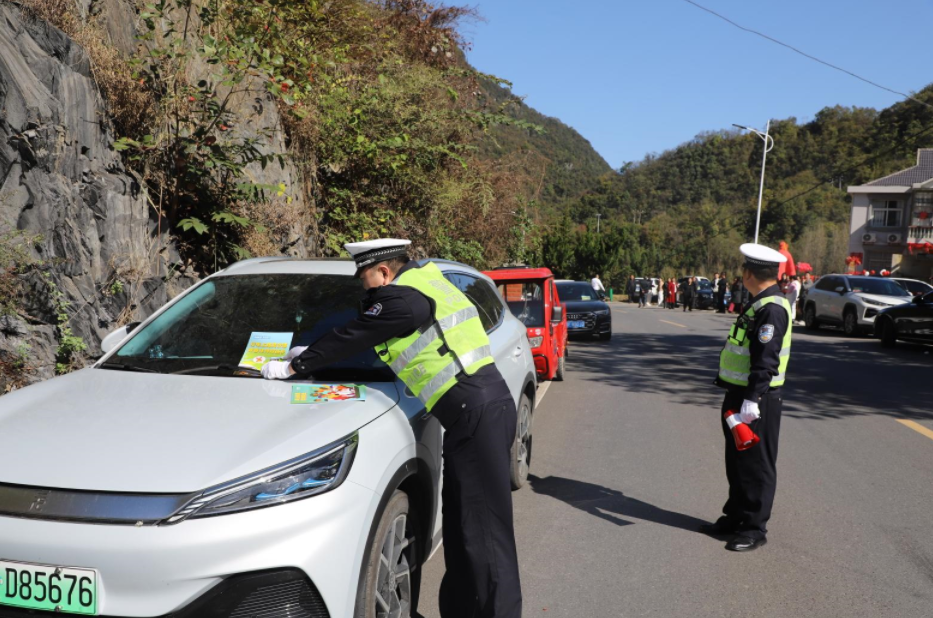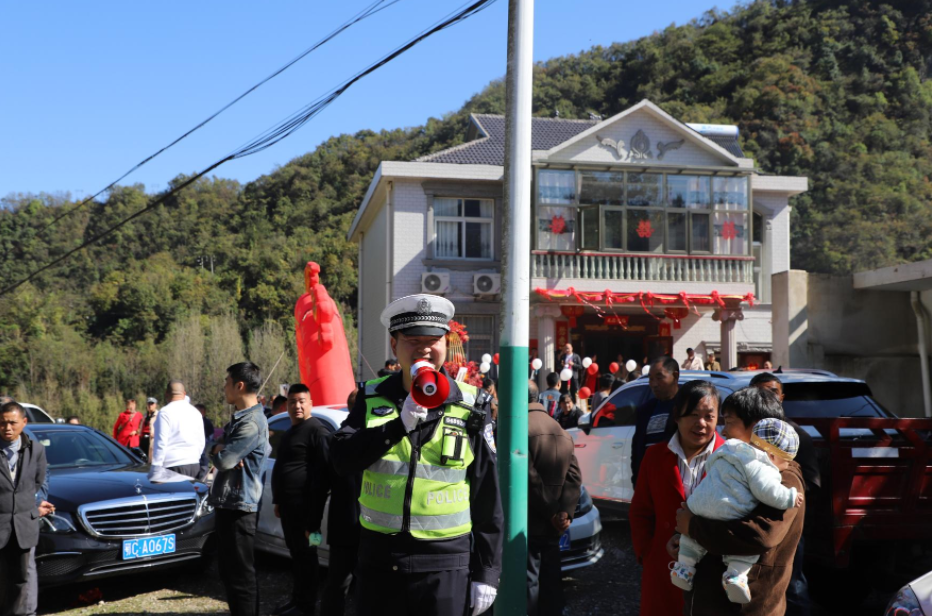 房县新闻网讯 通讯员 杨奥 报道:10月23日上午,房县公安局交警大队五中队队长曹颇正在执勤时,得知辖区内杜川村李姓村民家正在举办婚礼,随即带领民辅警走进婚礼现场,趁着人多、车多等有利时机,巧借婚礼宣传交通安全知识。