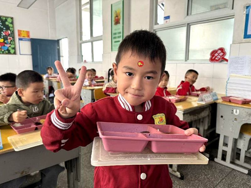 “今天中午吃的是麻婆豆腐,豇豆炒肉丝,香软土豆块。昨天的饭也很香,有妈妈的味道,我把饭全部吃光了,一点没有浪费。”一年级的小同学一脸傲娇与满足地说,他很喜欢学校里可口的饭菜。