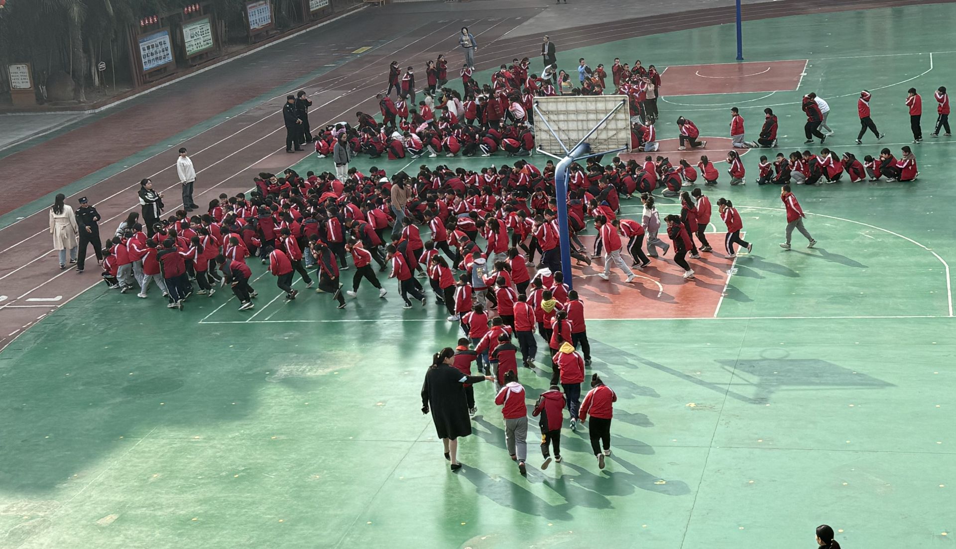 活动之前,各班主任讲解关于如何迅速逃离火灾现场的方法及一些安全小常识。随着紧急的警报声响起,“师生消防疏散演练”活动开始了。全校学生在教师的带领下,井然有序地弯着腰,佩戴口罩,用湿纸巾捂住鼻子沿着安全通道路线紧急疏散,撤离到安全地点,学生到达操场以后,老师以班级为单位集合后立即清点人数,并及时把学生人数及安全情况。
