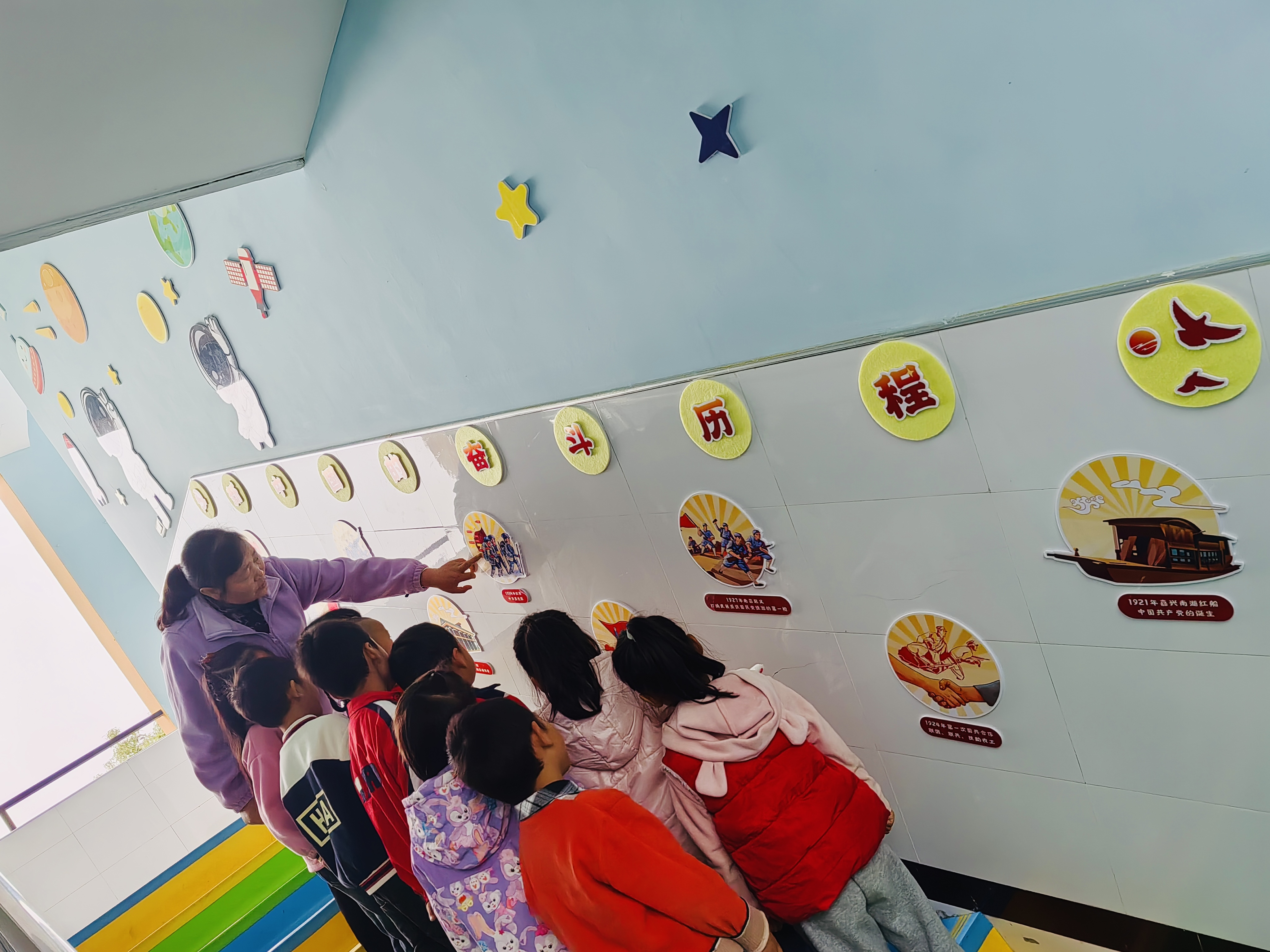 走进幼儿园,一幅幅展现新中国重大历史事件的图画映入眼帘。从嘉兴南湖的红船到天安门广场的开国大典,从抗美援朝的英勇奋战到改革开放的伟大转折,每一处环环节都生动地讲述着新中国的奋斗故事。