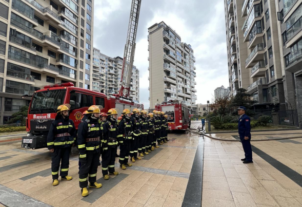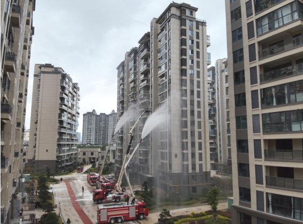 演练模拟某小区高层建筑发生火灾,火势蔓延,并伴随大量浓烟,有人员被困。随后根据高层建筑火灾特点,设定侦察、搜救、灭火、举高、供水、保障等战斗任务,采取“强攻近战、内外结合、逐区消灭”等技战术措施,集中开展火情侦察、现场组织指挥决策、启用固定消防设施、沿楼层铺设水带、登高平台车救人、外围举高车射水灭火、火场高层供水、战勤保障等演练环节。