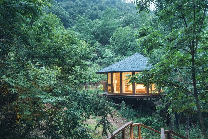 民宿共29间客房,不管是适合家庭出行的亲子滑梯套房,或是为三两好友露营野餐设计的帐篷木屋,还是为情侣浪漫出游打造的森林书屋,不同的游客群体总能在酒神湾找到适合自己的选择。一栋栋建筑散落山谷各处,与自然山野融为一体,私密性极强、体验感极佳。酒神湾民宿负责人张铭楷介绍,民宿可同时接待游客80人,截至目前已接待超6万人次,除来自省内武汉、襄阳、宜昌的游客外,还吸引来自河南郑州、南阳,陕西西安及北京、上海、广州等城市的众多游客慕名前来。