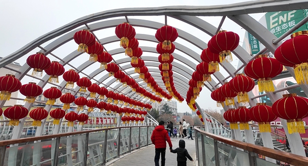 在城区十字街天桥,工人师傅正在悬挂大红灯笼。一个个崭新的红灯笼,为即将到来的春节增添了红红火火的色彩。