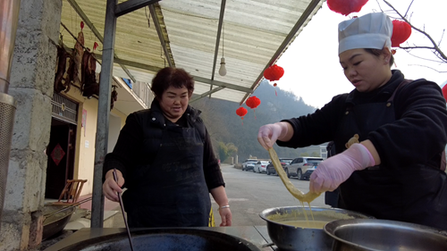 上龛乡仓坪村村民刘蕊介绍:“这个油要八成热,要选择本地的菜籽油,然后炸,炸出焦黄色就可以了,基本上成熟了再把捞起来 。”