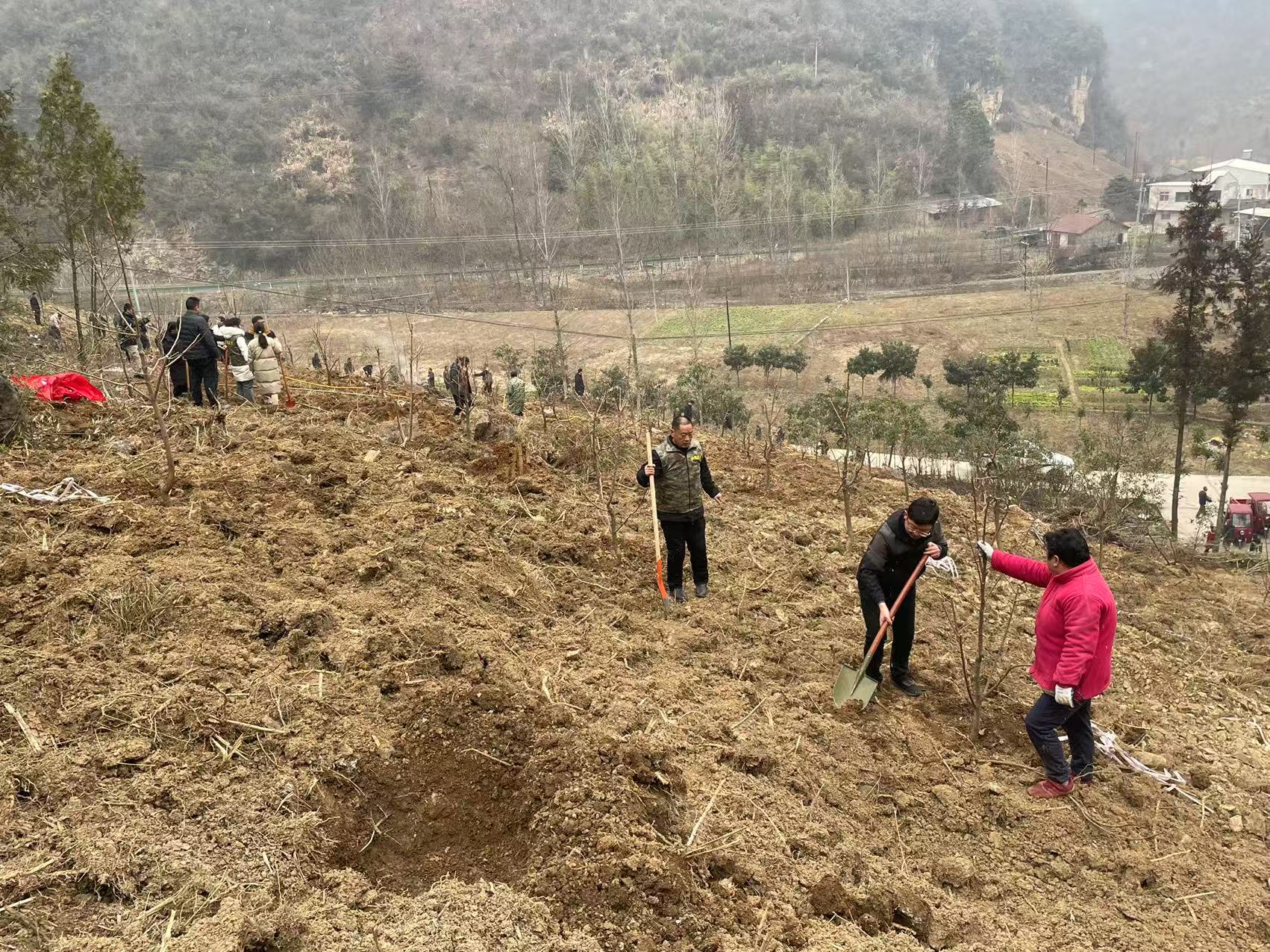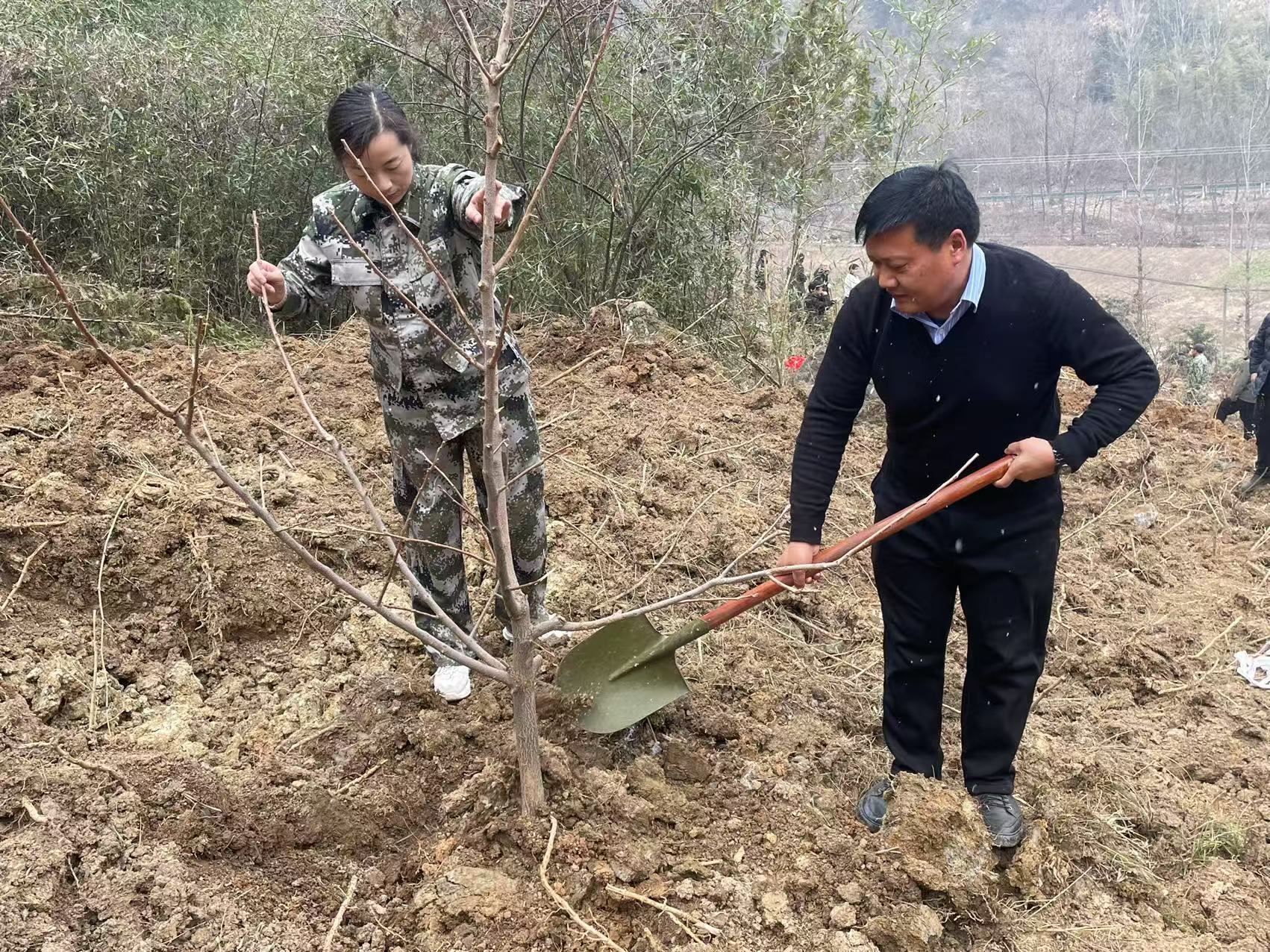 植树队伍抵达会子营村3组黄土包(小地名)后,按照活动方案,分工协作、团结互助,以“三埋、两踩、一轻提”栽种流程,两人一组或三人成队,挥锹铲土、扶苗培土,确保树苗栽植科学有序。此次活动植树队伍合力种下柿子树300株,现场党建“红”与生态“绿”相互映衬,为绿美乡村再添新绿。