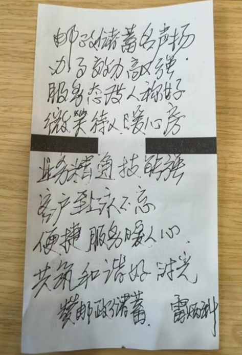 更令工作人员感动的是,业务办理完毕后,老人从衣兜里掏出一张折叠整齐的纸条——上面用工整字迹写就《赞邮储银行》:“服务态度人称好,微笑待人暖心房……便捷服务暖人心,共筑和谐好时光。”落款处“雷炳科”三个字力透纸背。