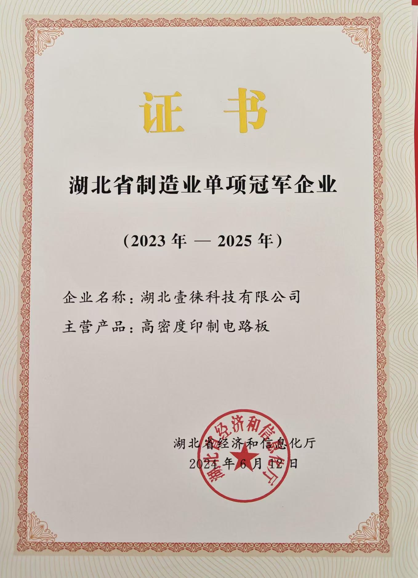 房县新闻网讯 通讯员 计金晶 张贞 报道:近日,位于我县北城工业园的湖北壹徕科技有限公司传来喜讯,该公司凭借在高密度印制电路板领域的突出表现,成功斩获由湖北省经济和信息化厅颁发的“湖北省制造业单项冠军企业(2023年—2025年)”称号。