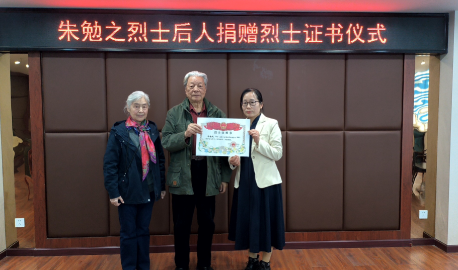 朱勉之烈士后人向房县捐赠烈士证书。(散钰泽 摄)