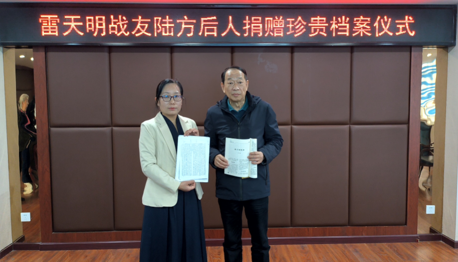 雷天明战友陆方后人向房县捐赠珍贵档案。(散钰泽 摄)