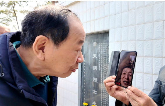当天,房县烈士陵园。刘士明、张德溢、余策星等人共同祭扫雷天明墓。在墓前,刘士明与雷天明的女儿雷英进行视频连线。