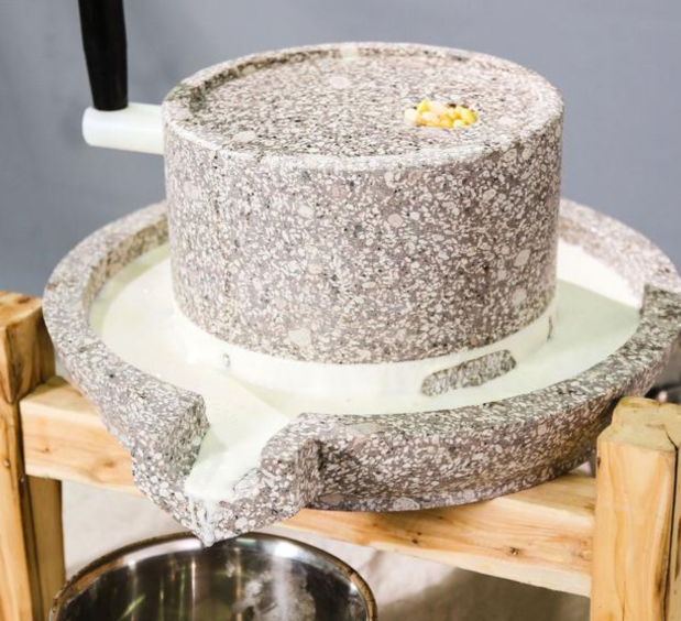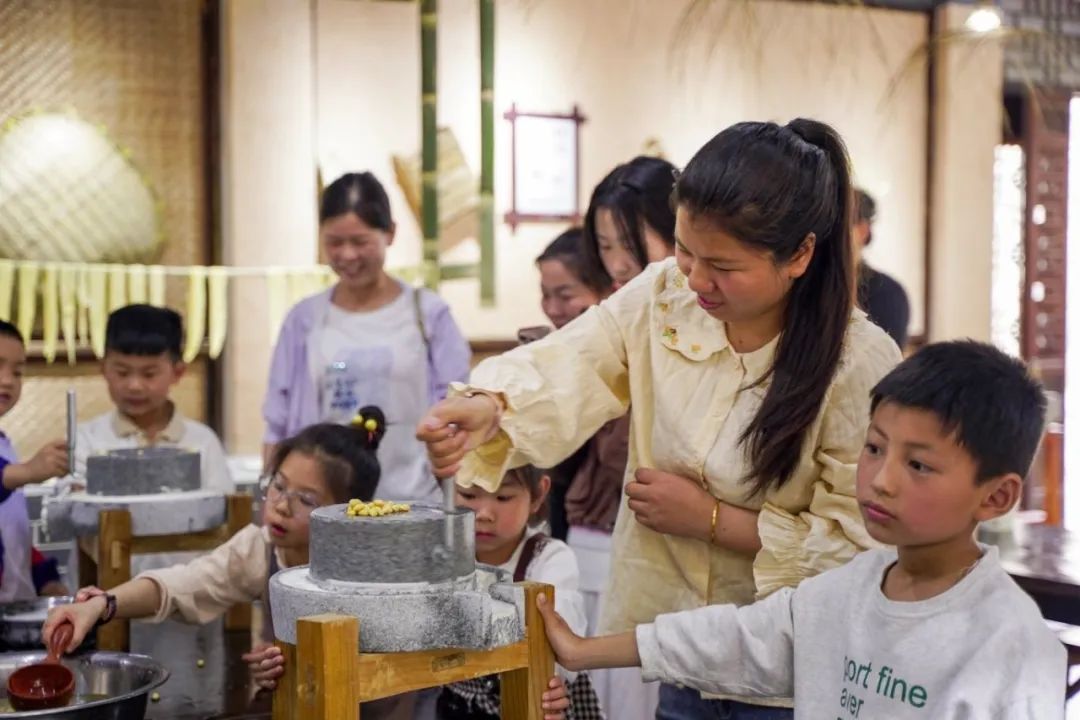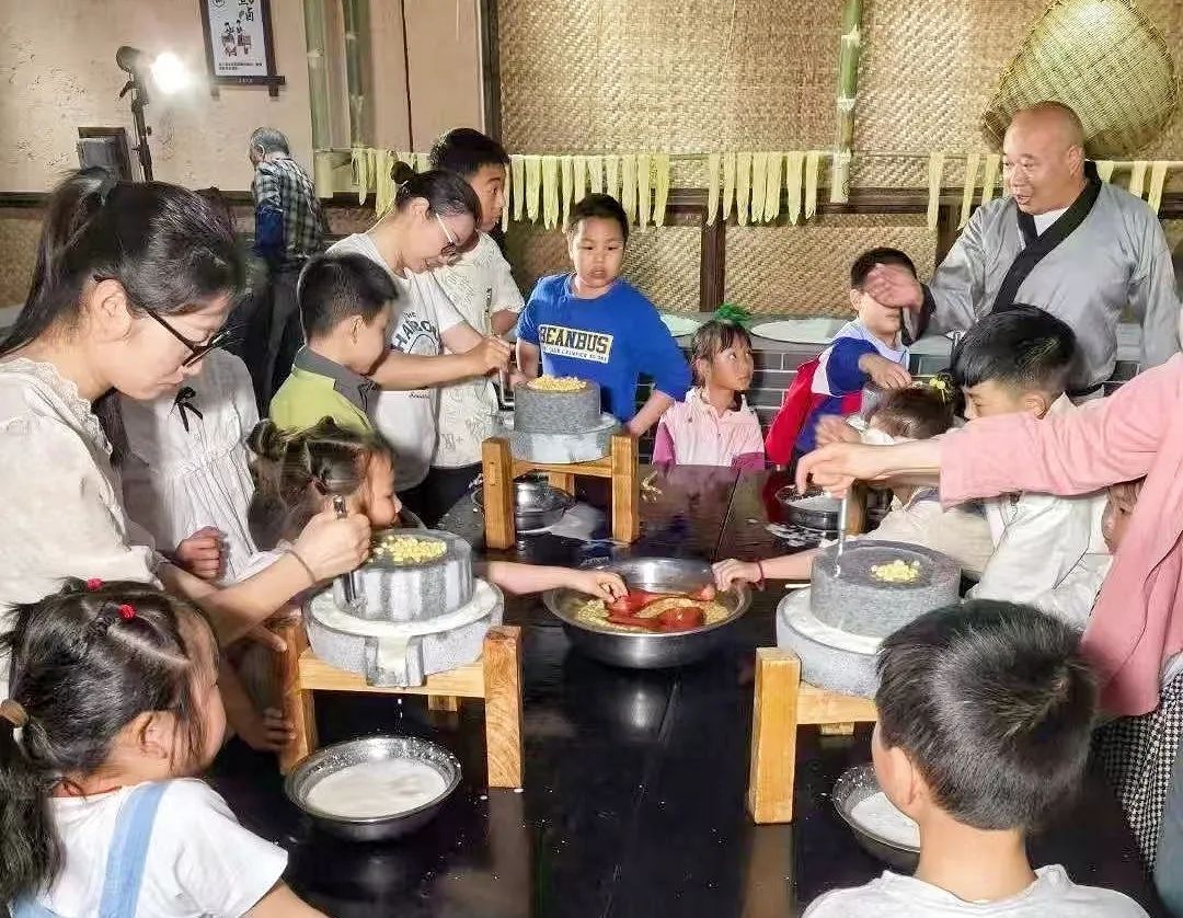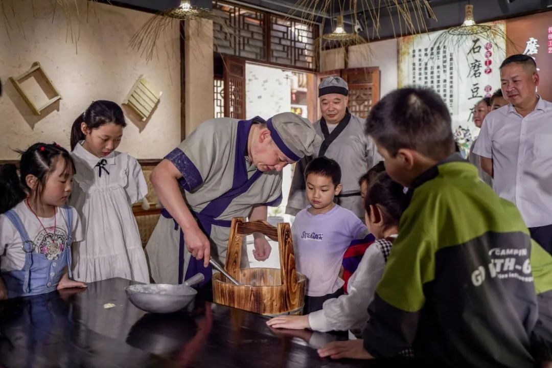 孩子们轮流推动传统石磨,看着黄豆慢慢变成乳白的豆浆。随后在师傅的带领下,纷纷动手参与包袱过滤,眼神里充满好奇。