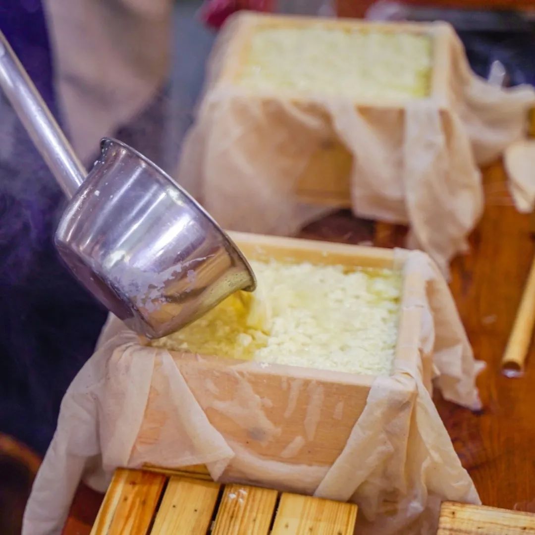 当师傅将卤水缓缓倒入煮好的豆浆中,孩子们屏住呼吸,慢慢凑近观察,见证液体凝固成豆花的奇妙过程。