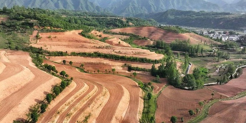 房县新闻网讯 通讯员 张启龙 余杉 报道:5月18日,房县军店镇中村小流域,整理后的一条条梯平地种上了玉米,促进粮食增产增收。