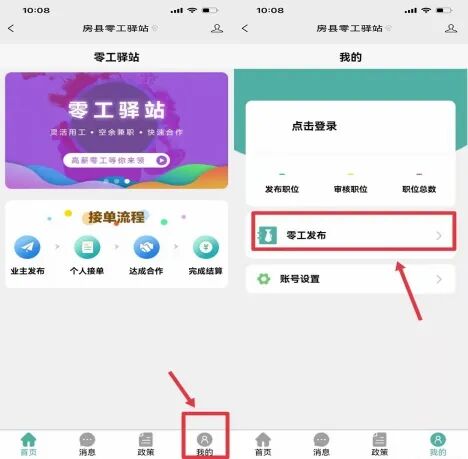 5. 点击“我的”,选择“零工发布”发布工作岗位