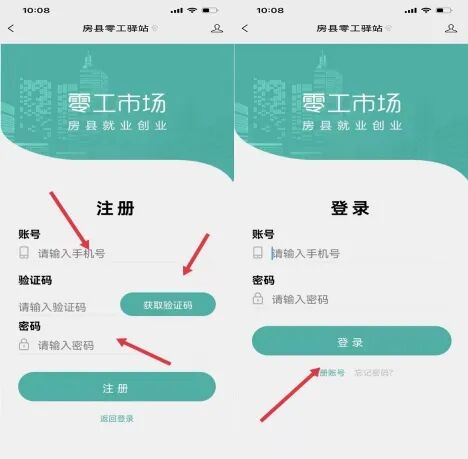 3. 输入手机号,点击“获取验证码”,输入验证码,输入密码点击“注册”,跳转至登录界面后输入账号和密码点击“登录”