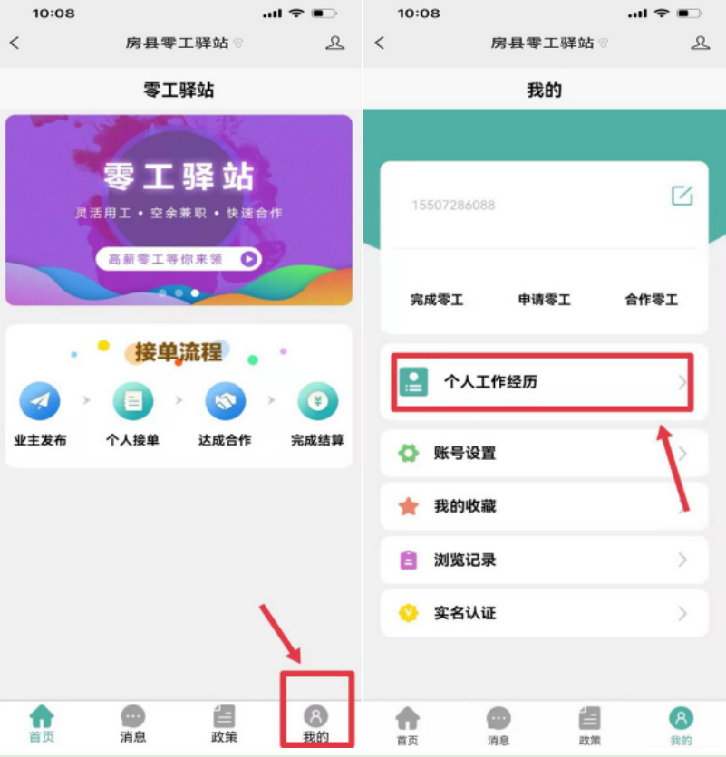 4. 登录成功后,进入零工市场首页,点击“我的”进入发布信息页面,选择“个人工作经历”进入创建零工信息页面
