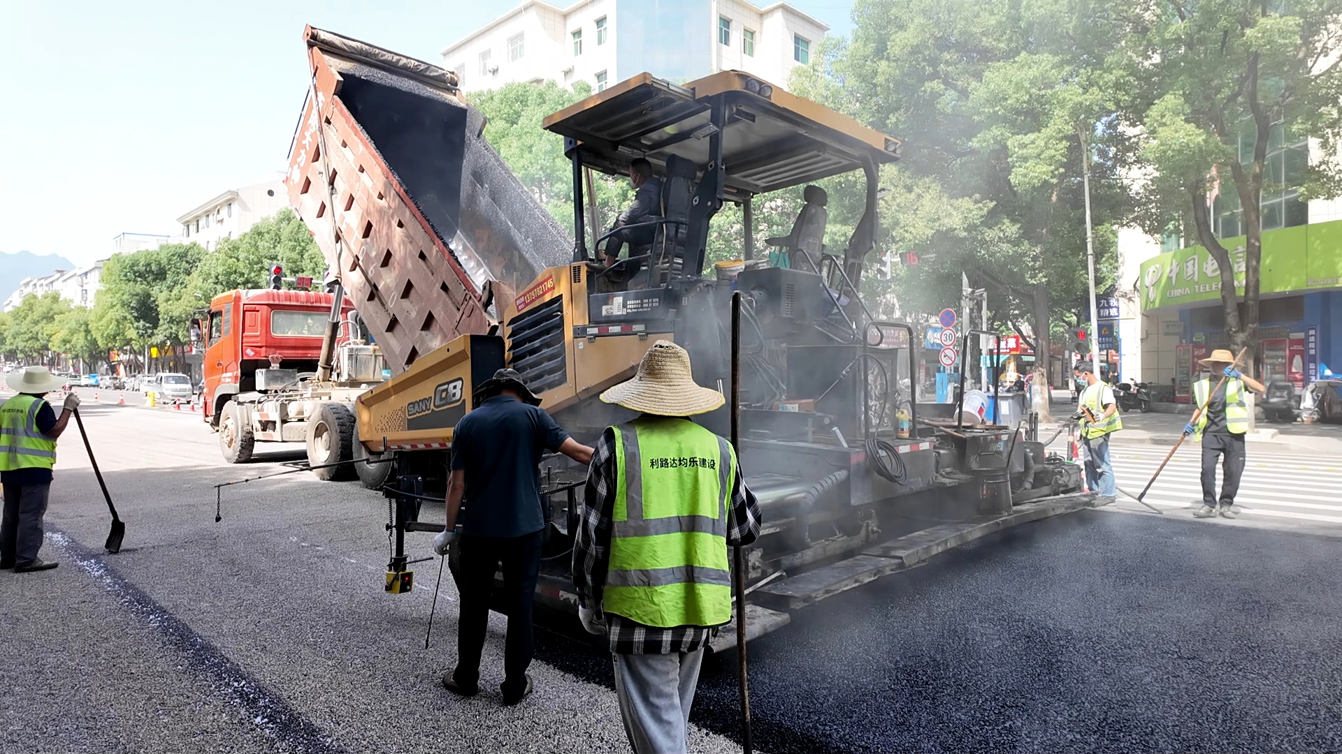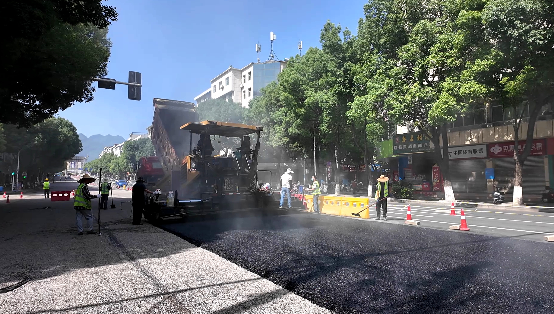 6月16日,记者在武当路看到,施工人员正在进行沥青摊铺作业,摊铺机与压路机紧密配合,将沥青混合料均匀铺开压实,主干道在机械与人力协作中渐露新颜。