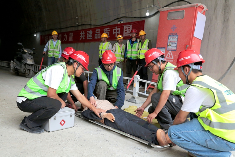 此次演练模拟柳树垭隧道进口段左洞掌子面因持续阴雨天气突发坍塌,1名工人被困洞内。现场安全员发现险情后,通过步话机紧急上报险情,项目应急救援指挥部立即启动应急响应机制。相关部门按照预案开展应急处置,警戒保卫组3分钟内完成现场封控,经多部门协同配合,通过人员疏散、隧洞坍塌事故应急救援抢险、医疗急救等流程,从事故报告、现场警戒、抢险救援到医疗救护,全流程仅用时30分钟,被困人员成功获救。
