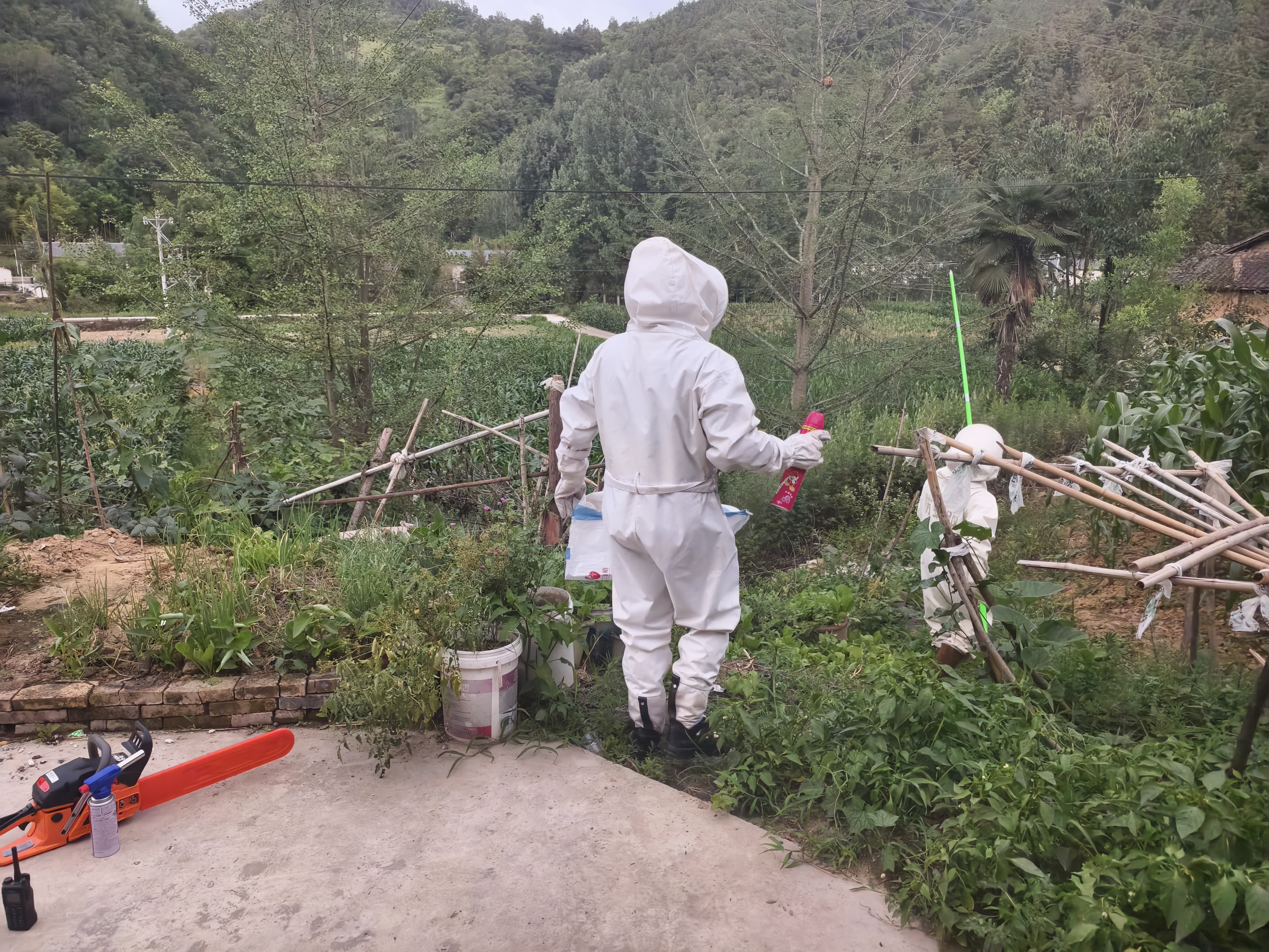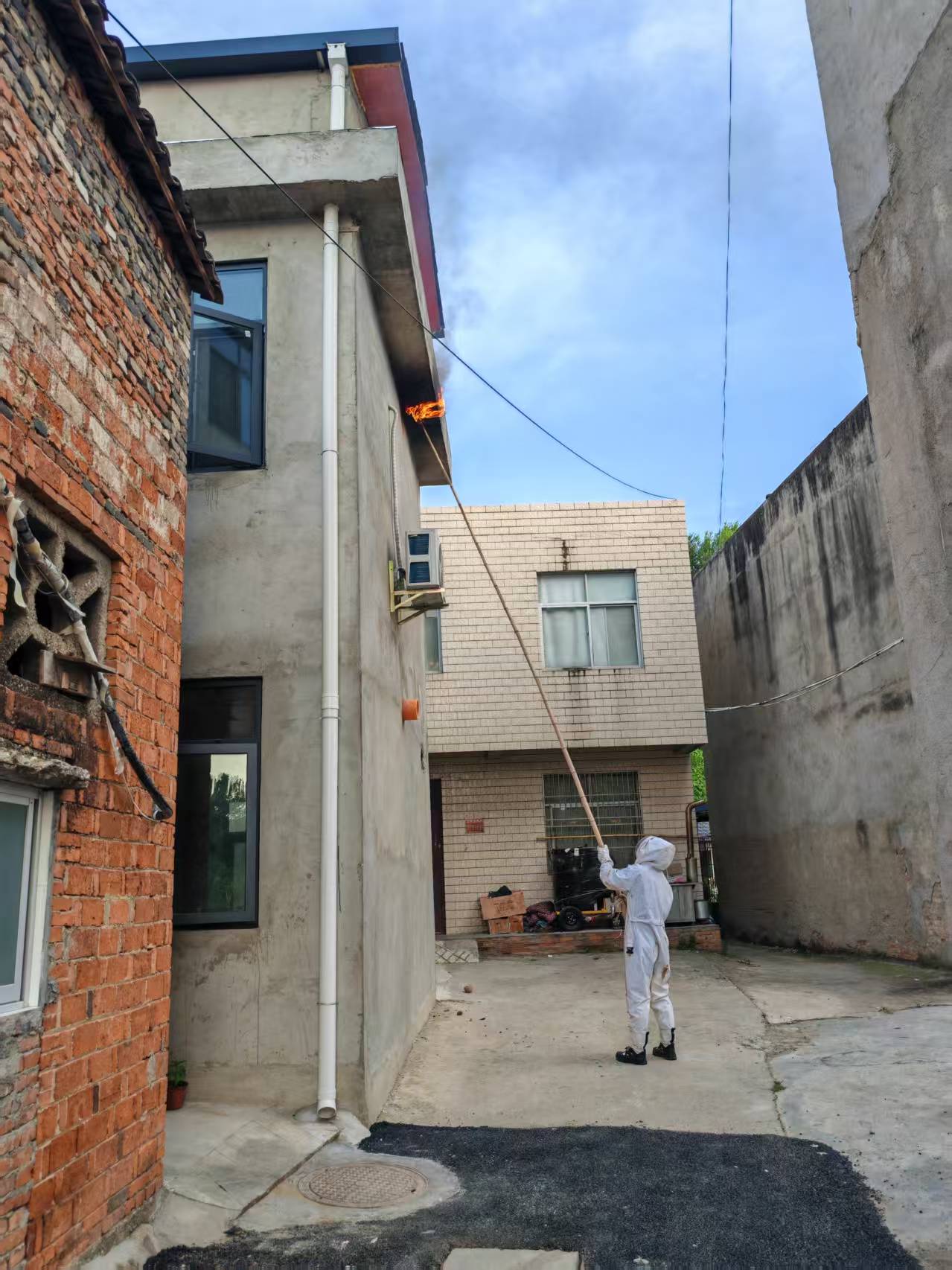 抵达现场后,消防员立即设置警戒区域,疏散周边群众,提示住户关闭门窗,严防蜂群伤人。经现场勘察,发现该马蜂窝筑于高处且体积较大,蜂群数量多,结合现场环境,指挥员果断决定采用“火攻”战术。消防员穿戴全套防蜂服,携带专业灭火器材,利用火攻精准灼烧蜂窝,快速瓦解蜂巢结构,同时使用杀虫剂对残余蜂群进行消杀。在确保无漏网蜂群后,将焚毁的马蜂窝残骸妥善清理。