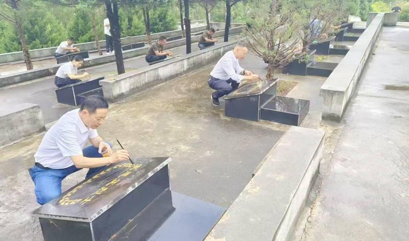 在烈士墓碑区域,党员干部们手持抹布、毛笔、油漆等工具,开展烈士墓碑擦拭和描红工作。大家分工协作,仔细清理墓碑周边的杂草杂物,认真擦拭碑体灰尘,一笔一画为碑文描红。让每一座墓碑都重焕庄严光彩,在实践中感悟革命先辈的崇高精神。