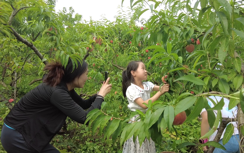 在高碑村湖北绿野农业科技发展有限公司的水果基地里,饱满水润的桃子压弯了枝头,漫步果园,桃香四溢,引得不少游客前来采摘。“老人小孩都爱吃,我们每年都过来摘,今天摘了几十斤,他们这果园里面还有好多葡萄、梨子,每个季节的都有水果。”游客张小丽一边采摘着鲜嫩多汁的桃子,一边开心地说道。