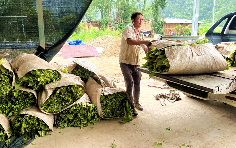 在黄杨村烤烟房前,满载烟叶的农用车整齐停放,烟农来回卸载、搬运。“现在是烤烟关键期,每天都要请十多个村民来帮忙。现在采收的烟叶已经有两炉正在烘烤,平均下来干叶就是一千斤左右,卖的话一炉烟平均就在七八千块钱,剩下的80亩,估计再有50天就采收完了。”另一位种植户朱武斌介绍道。