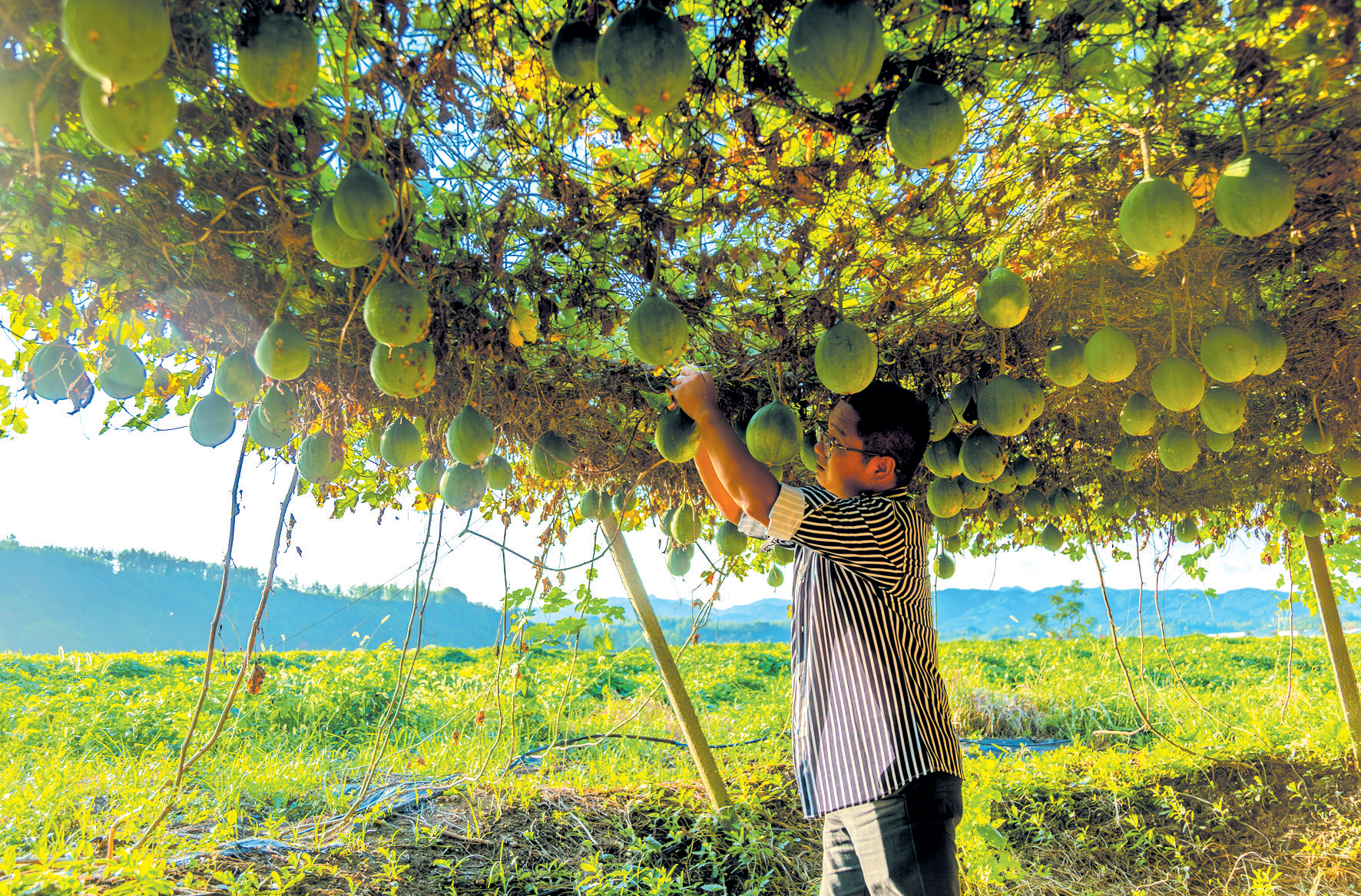 8月18日,记者在房县军店镇中村村吊瓜种植基地看到,绿油油的吊瓜藤爬满网架,一个个圆润饱满的吊瓜从藤间垂落,长势喜人。村民正抢抓农时,忙着除草、整枝、浇水,为吊瓜丰收筑牢基础。吊瓜又名栝楼,除瓜皮、根茎可入药外,晒干的瓜籽还能直接售卖,具有较高的经济价值。近年来,中村村采取“党支部引领+合作社+农户”模式,以吊瓜种植为核心,不断延伸产业链,增加了村民收入,提升了产业效益,更壮大了村集体经济。(十堰日报 记者 刘昆)