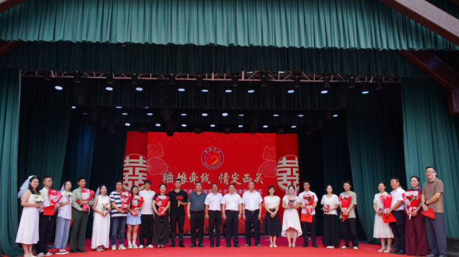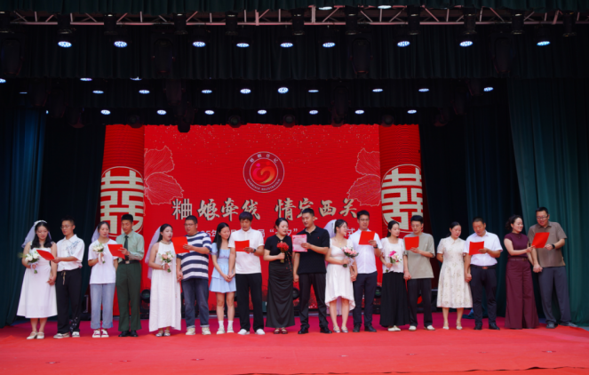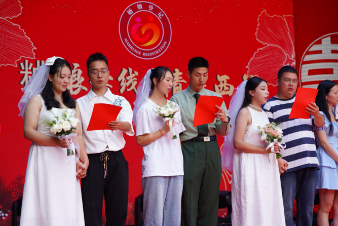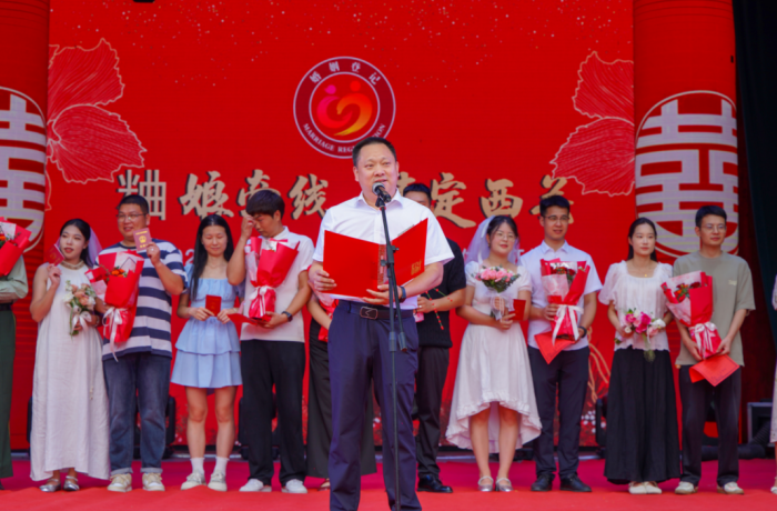 县委宣传部副部长陆龙杰,县民政局党组书记、局长付超,县文旅局党组书记、局长陆龙权,县文旅局副局长戢波,县民政局副局长杨小兵,县民政局副局长任娟,县民政局党组成员、低保局长何猛,房县西关老街文旅有限公司董事长罗良军、副总经理杨波为新人颁发结婚证书。县委宣传部副部长陆龙杰邀请新人一同举杯庆祝,并倡议“弘扬社会新风、倡导婚事新办”,鼓励新人们顺应时代潮流,走在时代前列,谱写精彩婚姻新风尚。