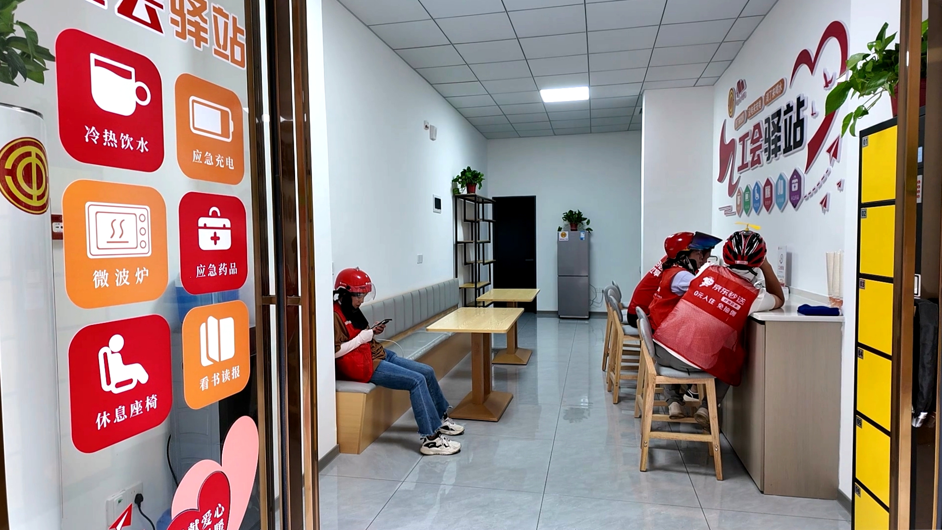外卖骑手丁艳说:“以前我们骑手没有单的时候,我们都在大街小巷在街头,尤其是下雨,现在我们不一样了,现在这里的环境非常好,有空调,还有热饭的地方,还可以充电。下雨了我们可以在这里躲雨,中午的话我们可以在这里休息。我为这个举措点赞。”