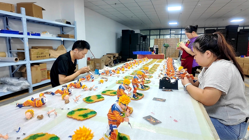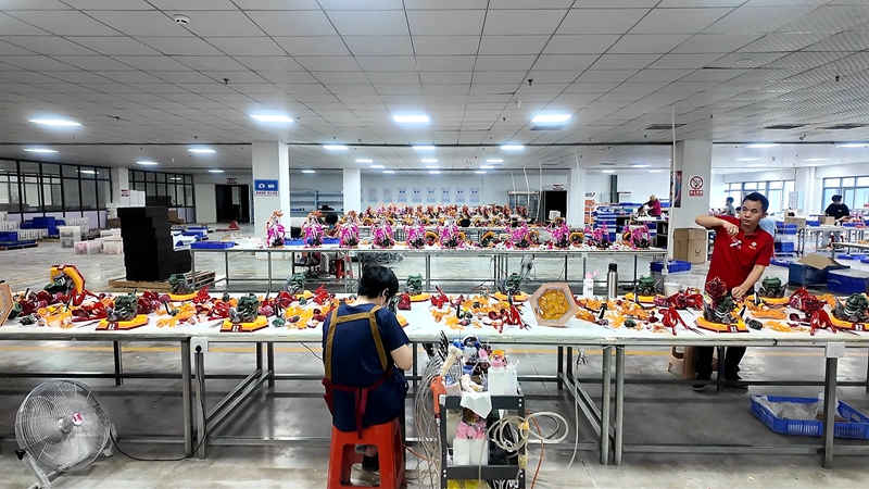 走进馨彩动漫万余平方米的宽敞厂房,9条生产线正全速运转。在注塑机的低沉嗡鸣中,液态树脂在精密模具中缓缓凝固,“生长”为发丝毕现、衣袂飘逸的动漫角色坯体。随后,经过喷涂匠人的手工精绘,这些模型被赋予灵魂、宛若新生,最终华丽蜕变为身价数千元的精致藏品。这样高水准的产品,每天都在以稳定的规模发往全球。