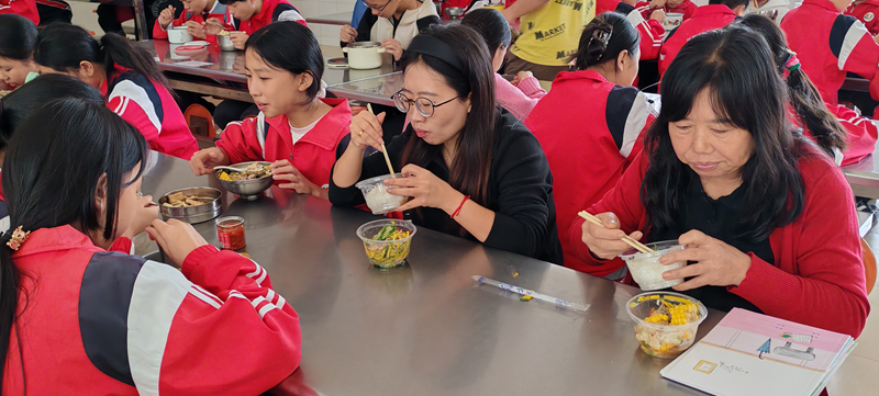 活动最后,家委会成员还深入食堂开展实地体验,他们先后查看食材储存间、烹饪操作区、餐具消毒间,详细了解食材采购渠道、每日菜品留样制度及卫生消杀流程;随后走进学生餐厅,与就餐学生同坐一桌、同吃一碗饭,亲身体验当日午餐的口感与分量。