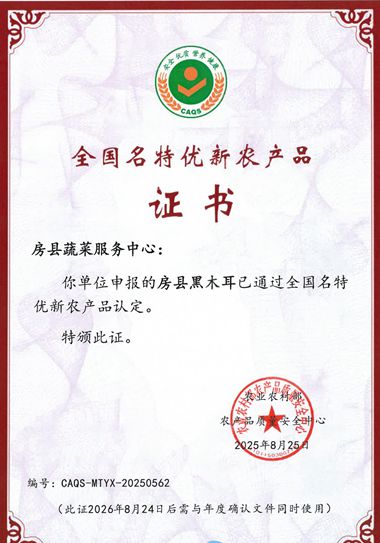 房县新闻网讯 通讯员 刘瑞、唐燃 报道 近日,农业农村部农产品质量安全中心正式为房县香菇、房县黑木耳颁发全国名特优新农产品证书。十堰市仅房县首次获此殊荣。