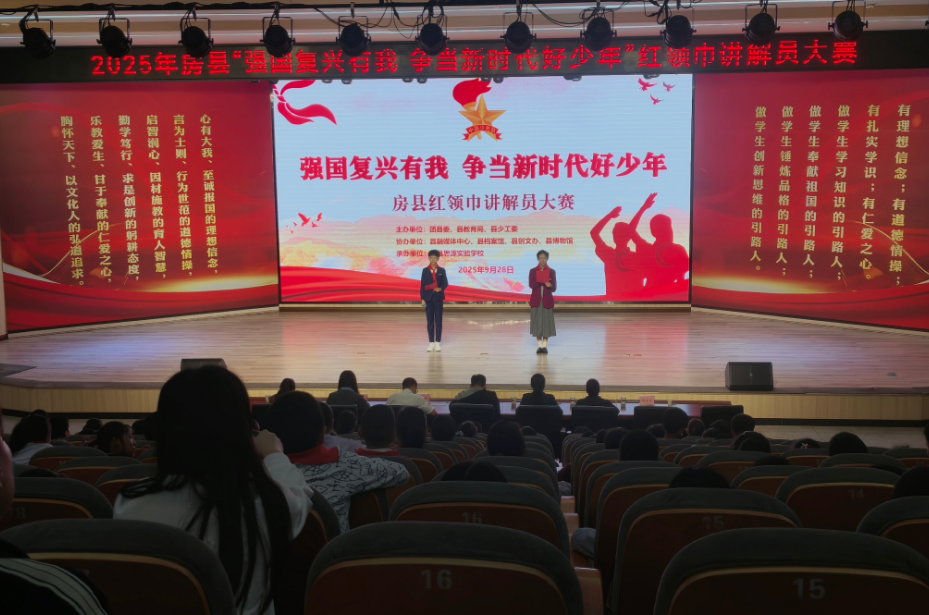 房县新闻网讯 通讯员 樊炎炎 报道:9月28日下午,房县“强国复兴有我 争当新时代好少年”红领巾讲解员大赛在房县思源实验学校报告厅举行。来自全县各学校的22名优秀“红领巾讲解员”同台竞技,以饱满的热情和真挚的情感,讲述抗战英烈事迹、红色历史事件以及新时代青少年的责任担当,生动诠释了“强国复兴有我”的深刻内涵。