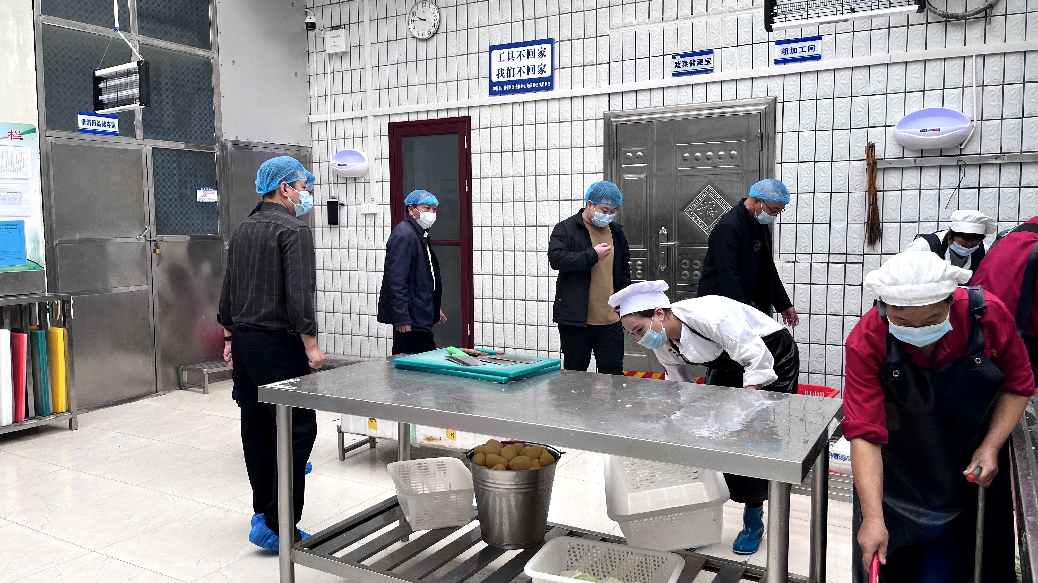 检查组一行按照食品安全检查标准,对学校食堂的各个环节进行了细致排查。在食材处理区,工作人员正在规范操作,各类蔬菜经过清洗、切配分区明确,厨具摆放整齐。检查组重点查看了食材的新鲜度、存储条件,确保从源头把控食品安全;在食材储存室,检查组仔细检查了面粉、大米等食材的生产日期、保质期及储存环境,对食材的分类存放、台账记录等情况进行了逐一核实,确保每一袋食材都可追溯、有保障。