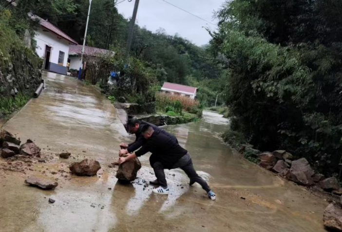 垮方路段抢通民生“动脉”。受降雨影响,通村主干道一处山体发生垮方,巨石、泥沙与断枝阻塞路面,积水深达20厘米,多辆返乡车辆受困。工作队手持铁锹和锄头等工具投入清障,村干部同步引导车辆分流。经过1小时协同奋战,路面全面恢复通行,新开挖的30米临时排水沟将积水引入山涧,有效化解险情。