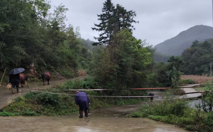 漫水桥前拉起警戒“红线”。上午8时30分,巡查队行至1组漫水桥时,发现桥面已被上涨的河水淹没约10厘米。驻村第一书记杜勤当即下令封桥避险。队员们迅速设置警示牌、拉设隔离带,并安排专人轮岗值守。同时,通过村组微信群、大喇叭等渠道实时发布绕行提示,确保群众出行“看得见警示、听得懂引导、走得通路线”。