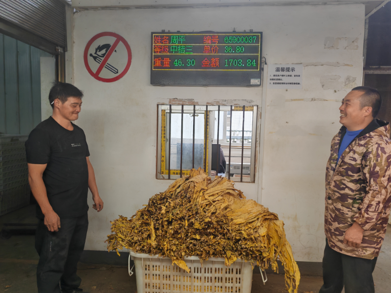 房县新闻网讯 通讯员 肖丹 海伦 柯伟 报道:“周平,中桔三,金额1703.84元。”9月29日一大早,九道乡烟叶收购站的电子磅播报声清脆响亮,烟农周平的一筐鲜烟叶顺利完成分级前置、分拣、定级、过磅全流程,成为九道乡烟叶收购站今年烟叶收购的“第一单”,标志着九道乡2025年烟叶收购工作正式拉开帷幕。