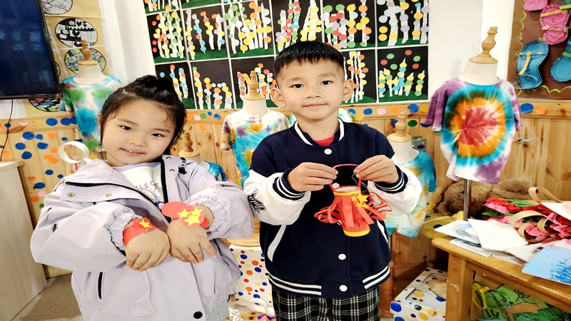 在升旗仪式上,教师为孩子们讲解国庆节的意义;孩子们与国旗合影,诉说着对祖国的美好祝福;手工课堂上,孩子们在老师指导下,自主选择材料与同伴共同制作中国结、灯笼等手工作品;同时,还组织幼儿观看红色电影、聆听红色故事、齐唱红色歌曲,让孩子们感知革命英雄事迹,为幼儿成长注入正能量。