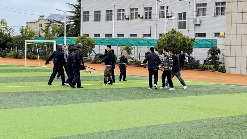 演练中,一名由教师扮演的“暴恐分子”持刀企图闯入教学区。值班保安发现后,立即启动防冲撞设施进行拦截,并按下应急警报。学校应急指挥组接报后,迅速启动预案,指挥应急防暴组携带防暴盾、钢叉等器械赶赴现场,与“暴徒”展开周旋与对峙,最终成功将其制服并带离。整个过程衔接紧密、反应迅速,师生沉着应对,有效检验了应急预案的可操作性。