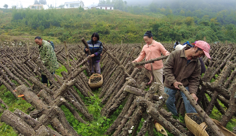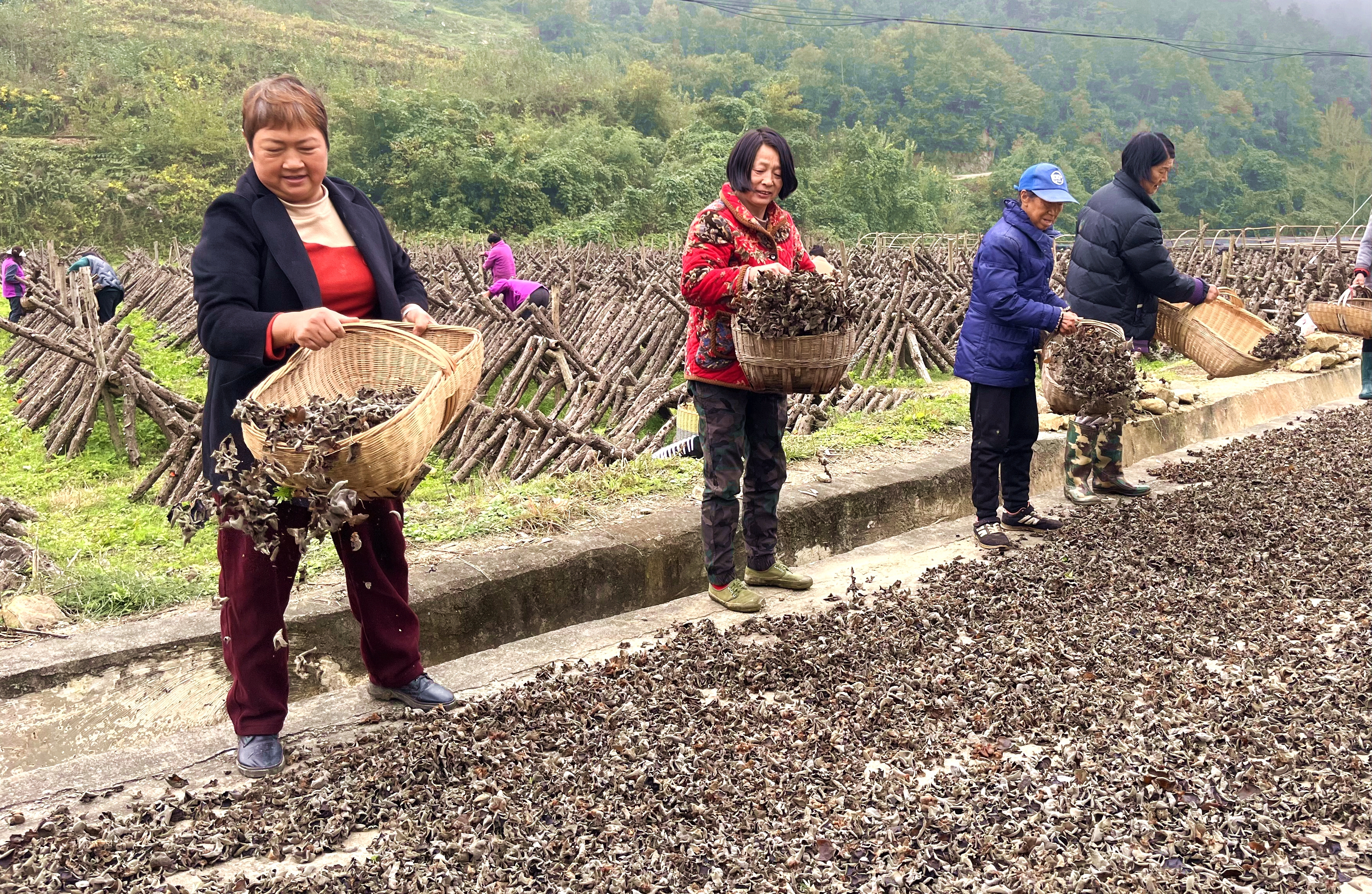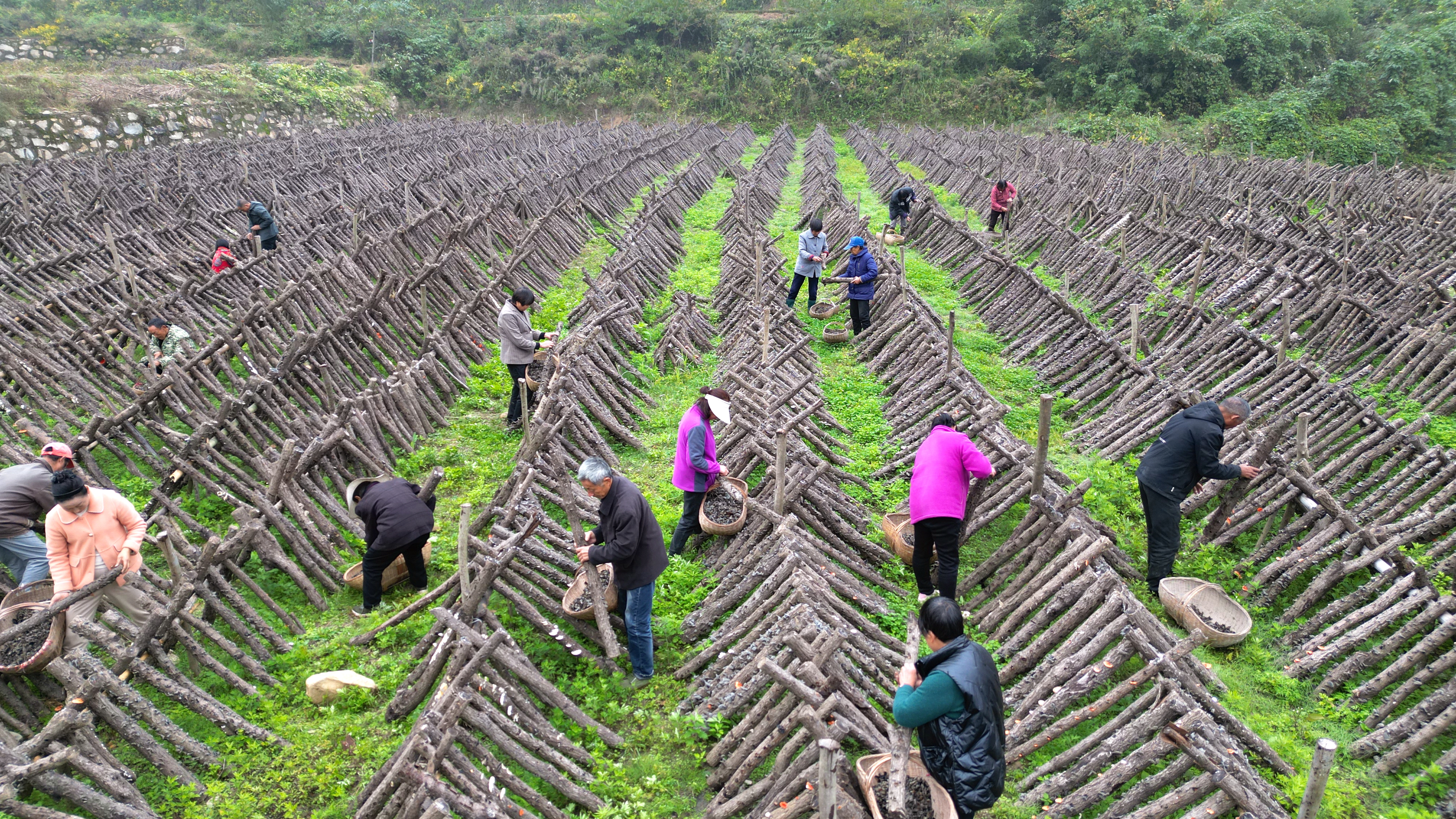 在黄杨村椴木食用菌基地,一排排椴木桩整齐排列,硕大肥厚的木耳长势喜人。村民们穿梭其间,手指翻飞间,一朵朵肉厚形优的木耳便落入筐中。