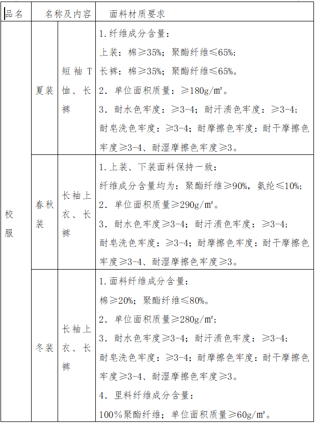 供应商所供应的校服不得使用有毒、过敏的染料即化学用剂,并能经过多次洗擦而无裂缝、无走纱、无走线、不变形、耐洗、耐磨、不掉色、不起球;服饰配件不易脱落、破损等,应当具备以下产品标识:生产企业名称标识、面辅料成分标识、洗涤方法标识、规格型号标识、校名标识等。安全与质量必须严格执行《国家纺织产品基本安全技术规范》(GB18401-2010)、《婴幼儿及儿童纺织产品安全技术规范》(GB31701-2015)、《中小学生校服》(GB/T31888-2015)等国家及地方标准,并负责对收到货物按服装执行标准要求进行验收并承担全部质量风险,在验收中若发现服装质量不符合规定要求的有权拒收。