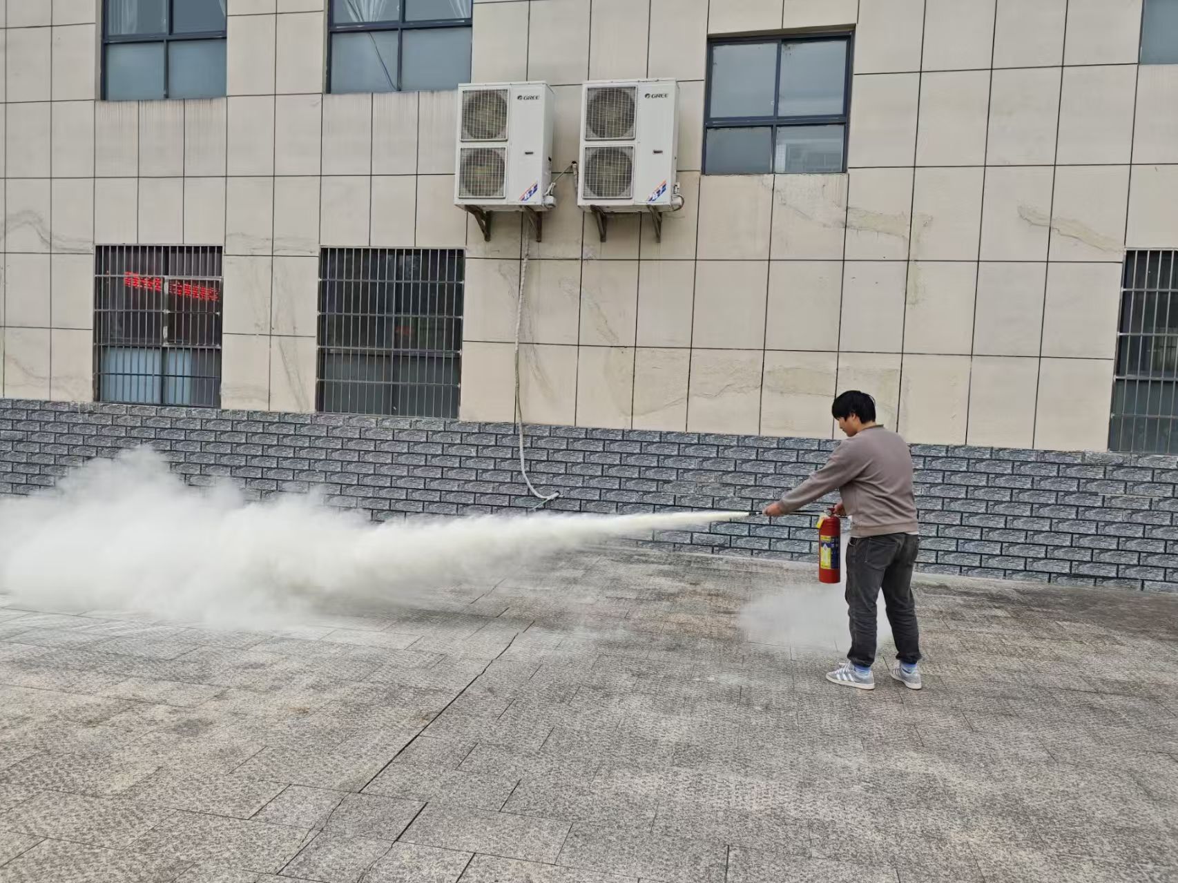 演练现场,老师手持灭火器,详细讲解了灭火器的使用原理、操作步骤以及注意事项。随后,在专业消防人员的指导下,参与师生亲身实践,拉动保险栓、对准火源、按下压把,一气呵成完成灭火操作,白色的灭火泡沫精准覆盖模拟火源,整个过程规范且高效。