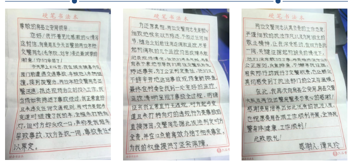 房县新闻网讯 通讯员 李丽娜 报道:11月7日,谭女士将一封《感谢信》送到房县公安局,感谢交通管理大队事故中队民警毛宇欣、辅警刘宇在处理一起交通事故时,以高度负责的态度和严谨细致的作风,成功查明事实、厘清责任,赢得群众的高度认可。