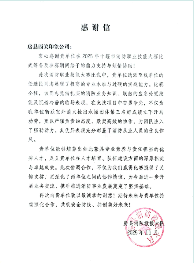 日前,房县消防救援大队发来感谢信,对西关印象选派员工任继民在“2025年十堰市消防职业技能大赛”中的出色表现表示高度赞赏。该同志凭借过硬的业务素质与稳定的临场发挥,为参赛团队赢得“室外消火栓出水操团体第三名”作出了重要贡献,充分彰显了西关印象员工队伍的专业实力与昂扬风采。