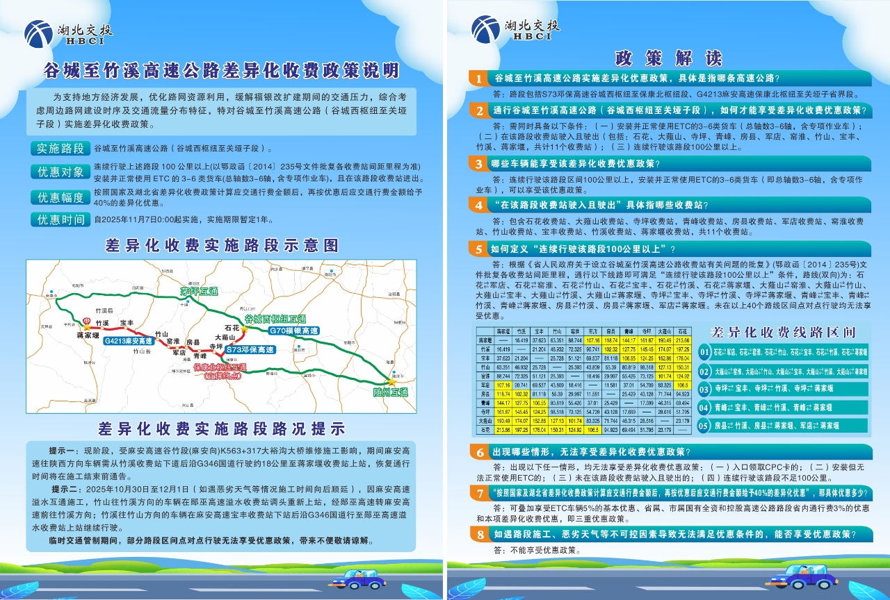 房县新闻网讯 通讯员杜红娥 冀宇 报道:12月4日,笔者从湖北交投鄂西北运营公司十房运营中心获悉,自2025年11月7日起,谷城至竹溪高速公路(谷竹高速)将为货车车主带来一项重磅优惠,货车在石花、大薤山、寺坪、青峰、房县、军店、窑淮、竹山、宝丰、竹溪、蒋家堰共计11个收费站之间,连续行驶里程超过100公里,即可在享受国家和湖北省既有通行费优惠政策基础上,再获得40%的额外优惠,该政策暂定执行一年,至2026年11月7日。