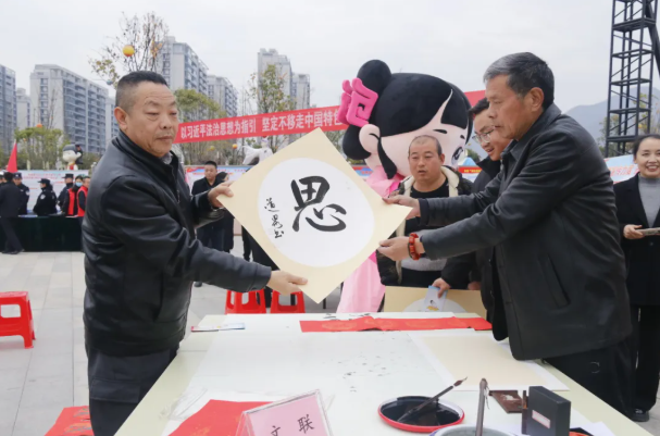 活动现场,书法、美术爱好者现场挥毫,为群众创作法治主题书画和春联。面对群众个性化需求,艺术家们一一应允,写下 “立规矩以定方圆,守法治方得始终” 等贴合需求的作品,获群众点赞留影。